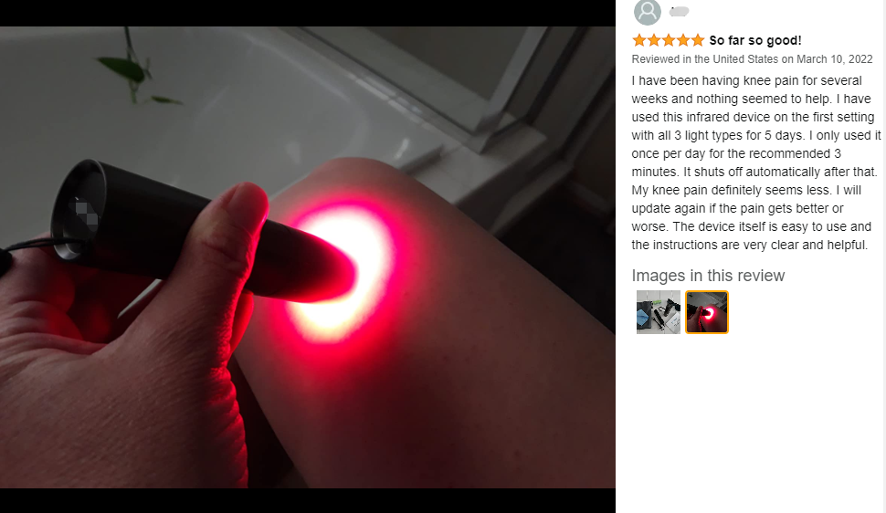 I have been having knee pain for severalweeks and nothing seemed to help.I haveused this infrared device on the first settingwith all 3 light types for 5 days.l only usedionce per day for the recommended 3