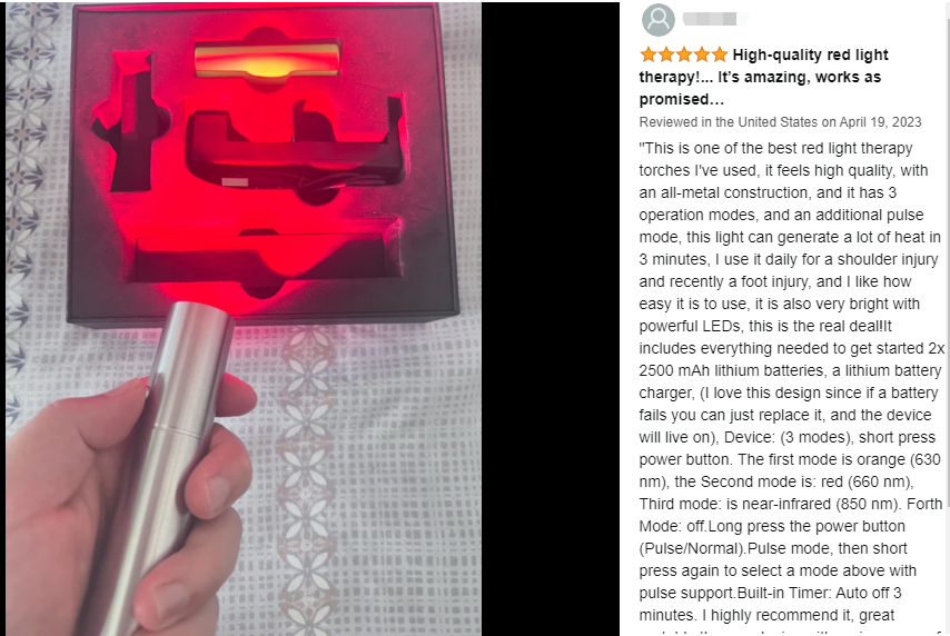 This is one of the best red light therapytorches I've used, it feels high quality. withan all-metal construction. and it has 3 operation modes.and an additional pulsemode, this light can generate a lot of heat in3 minutes, I use it daily for a shoulder injuryand recently a foot injury. and I like howeasv it is to use.it is also very bright withpowerful LEDsthis is the real deal!lt includes everything needed to get started 2x2500 mAh lithium batteries a lithium batterycharger (l love this design since if a batteryfails vou can just replace it. and the devicewill live on).Device. (3 modes) short presspower button. The first mode is orange (630nm) the Second mode is: red (660 nm). Third mode is near-infrared (850 nm)ForthMode: off.Long press the power button(Pulse/Normal).Pulse mode.then shortpress aqain to select a mode above withpulse support.Built-in Timer: Auto off 3minutes.I highly recommend it, great !