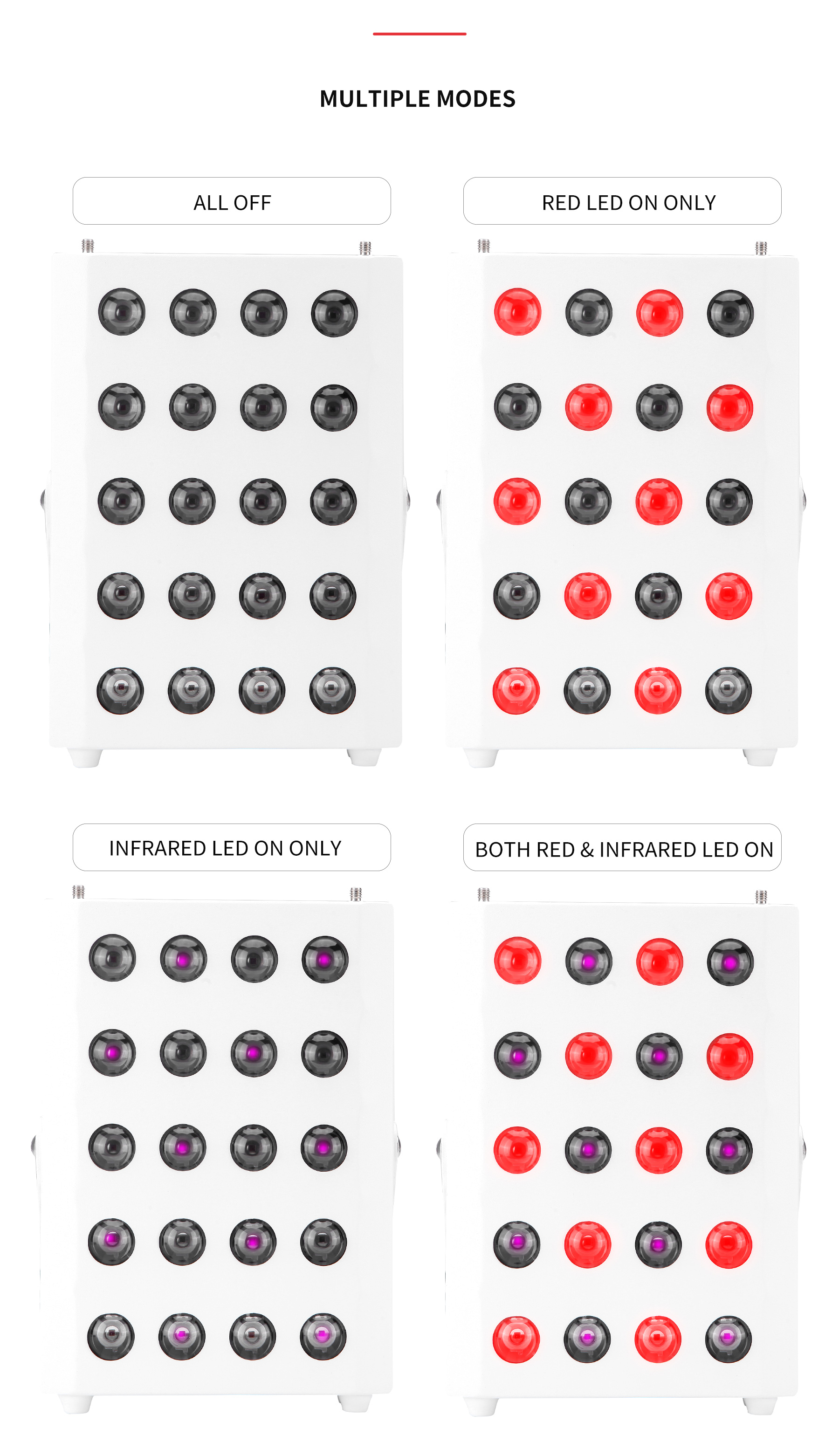 Kinreen high power 100 Watt light panel uses a combination of oversized red 660nm and oversized infrared 850nm LED diodes. Infrared and Red lights are turned on separately but also can be run simultaneously.