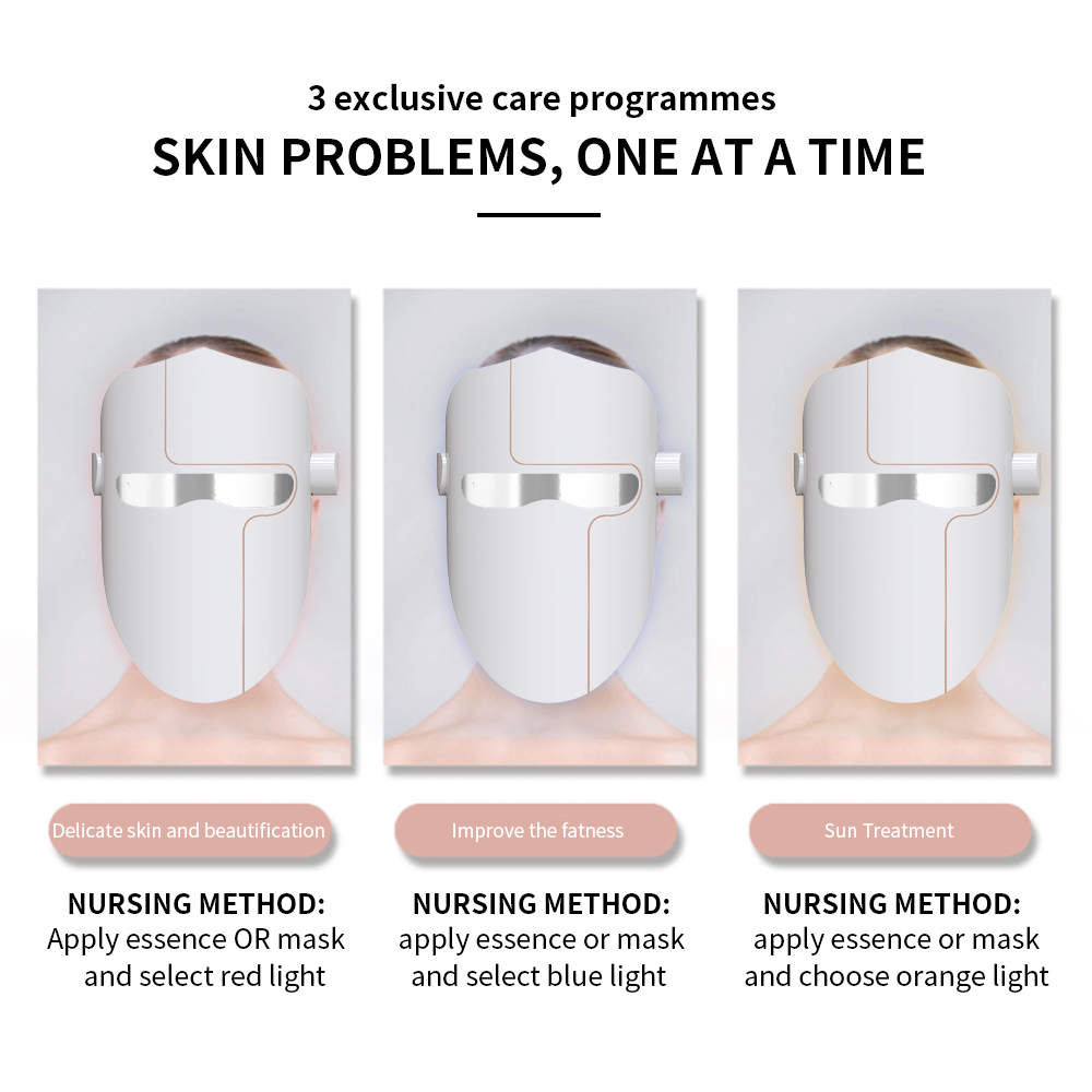 This mask used 3 kinds of light sources: red blue and orange, which is used to give the skin a gentle massage that accelerates the metabolism of the skin, make the skin bright and glossy. Evenly illuminate the specific light source with different wavelengths on the face can effectively reduce the production of acne, stimulate production of collagen , improve cell microcirculation, which can better achieve skin beauty combined with the mask and essnce.