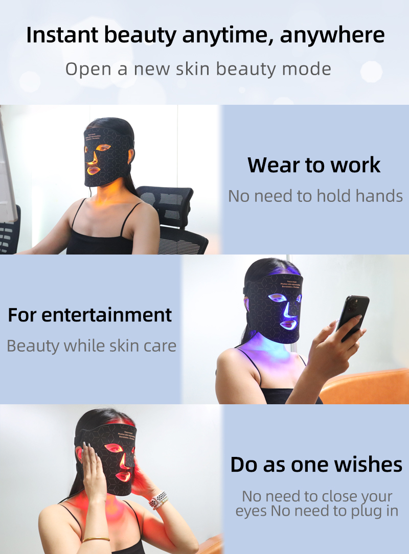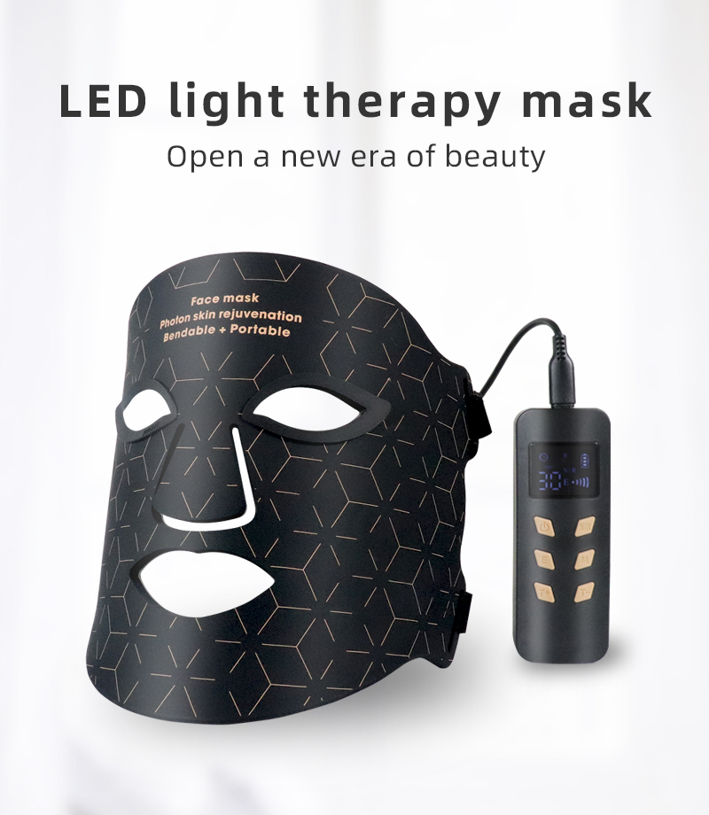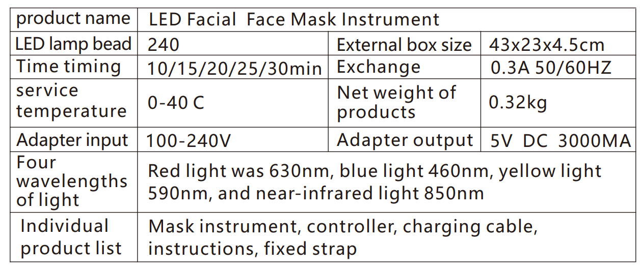 LED FACIA L MASK mask ins trument is a home wearable and rechargeable LED photo therapy beauty instrument device. The surface structure of this product is composed of medical silicone material, convenient and easy to use, folding and portable, different faces can be adjusted to adjust the nylon buckle fixed, suitable for different people. It consists of 240 high-quality LED diodes, divided into 60 blocks, each containing 4 LED beads, each of the four LED beads emitting 4 wavelengths, (red light 630nm, bluelight 460nm, yellow light 590nm, near-infrared light 850nm), And the controller can be adjusted to emit 3 different energy and different light time. Based on phototherapy, this product is more beneficial to penetrate deep into the skin, stimulate the collagen and elastin- producing cells, and achieve the effect of the skin beauty.